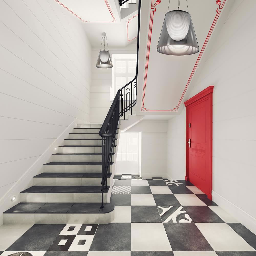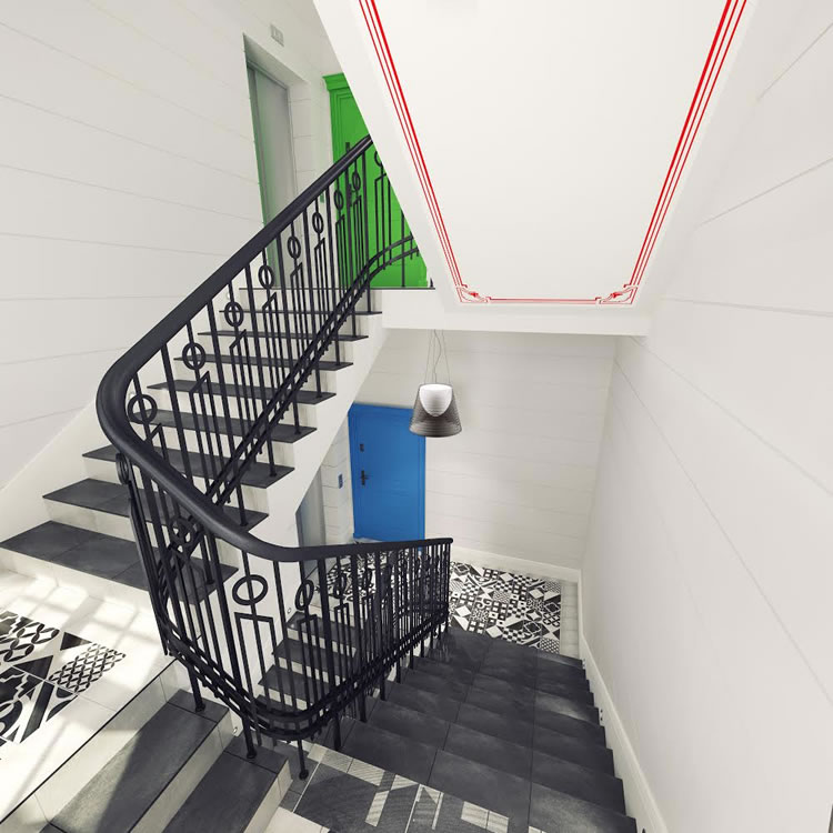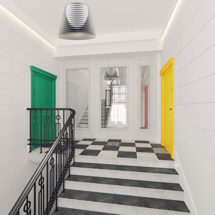 Klatka schodowa utrzymana w stylu eklektycznym jest doskonałym połączeniem nowoczesnej funkcjonalności ze sztuką klasyczną. Rożne kolory drzwi dodają jej świeżości.